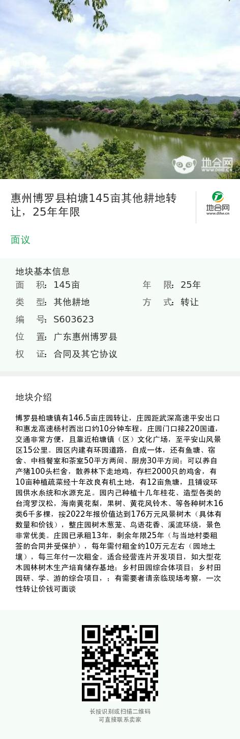 博罗县柏塘镇有146.5亩庄园转让,庄园距武深高速平安出口和惠龙高速杨村西出口约10分钟车程,庄园门口接220国道,交通非常方便,且靠近柏塘镇(区)文化广场,至平安山风景区15公里。园区内建有环园道路,自成一体,还有鱼塘、宿舍、中档餐室和茶室50平方两间、厨房30平方间;可以养自产猪100头栏舍,散养林下走地鸡,存栏2000只的鸡舍,有10亩种植疏菜经十年改良有机土地,有12亩魚塘,且铺设环园供水糸统和水源充足。园内己种植十几年桂花、造型各类的台湾罗汉松,海南黄花梨,果树、黄花风铃木、等各种树木16类6千多棵,按2022年报价值达到176万元风景树木(具体有数量和价钱),整庄园树木葱茏、鸟语花香、溪流环绕,景色非常优美。庄园已承租13年,剩余年限25年(与当地村委租签的合同并受保护),每年需付租金约10万元左右(园地土壤),每三年付一次租金。适合经营连片开发项目,如大型花木园林树木生产培育储存基地;乡村田园综合体项目;乡村田园研、学、游的综合项目,;有需要者请亲临现场考察,一次性转让价钱可面谈